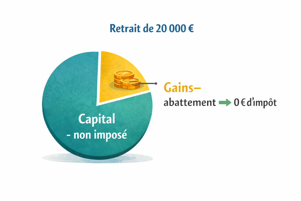 👉 la fiscalité ne porte jamais sur le capital que vous avez versé, 👉 elle porte uniquement sur la part de gains comprise dans le retrait.